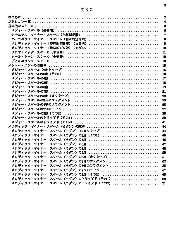 第I巻では、もっとも基本的な低音ポジションにおける各種スケールと、メジャー・スケール、メロディック・マイナー・スケールとそのインターバル、フラグメント(断片)、分散和音について学びます。