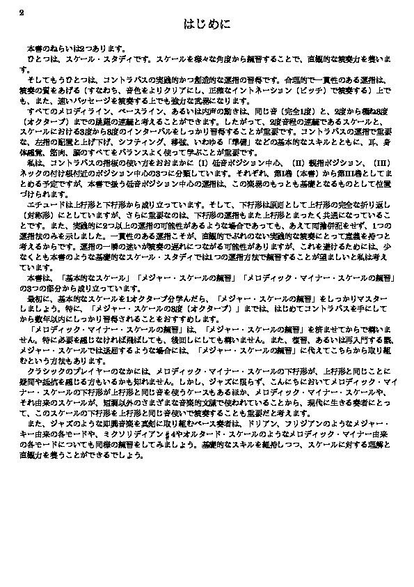 本書は、「基本的なスケール」「メジャー・スケールの練習」「メロディック・マイナー・スケールの練習」の3つの部分から成り立っています。最初に、基本的なスケールを1オクターブ分学んだら、「メジャー・スケールの練習」をしっかりマスターしましょう。特に、「メジャー・スケールの8度(オクターブ)」までは、はじめてコントラバスを手にしてから数年以内にしっかり習得されることをおすすめします。