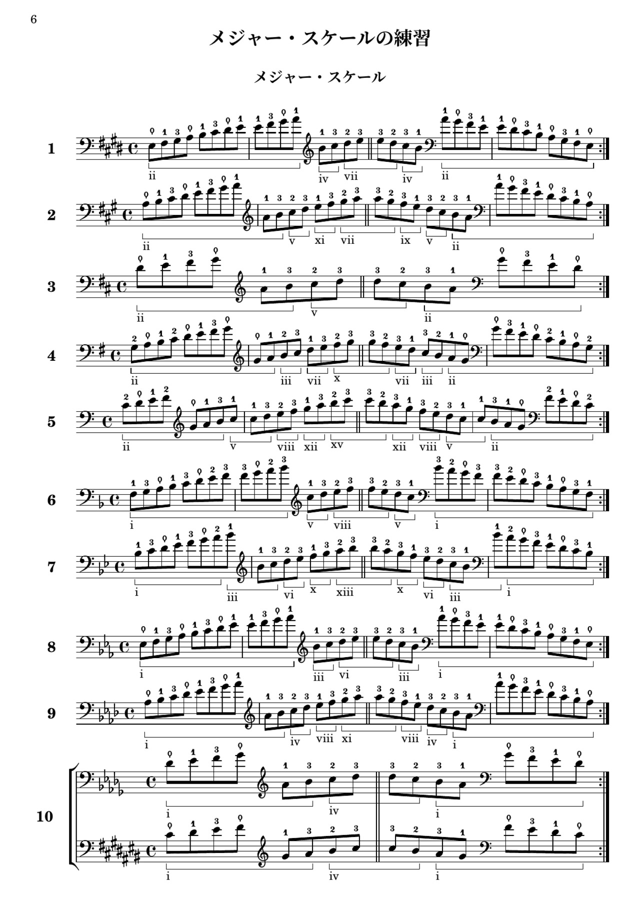 第II巻では、親指ポジションにおけるメジャー・スケール、メロディック・マイナー・スケールとスケールのフラグメント(断片)、その3度から6度までのインターバル、6度と7度の練習、分散和音について学びます。